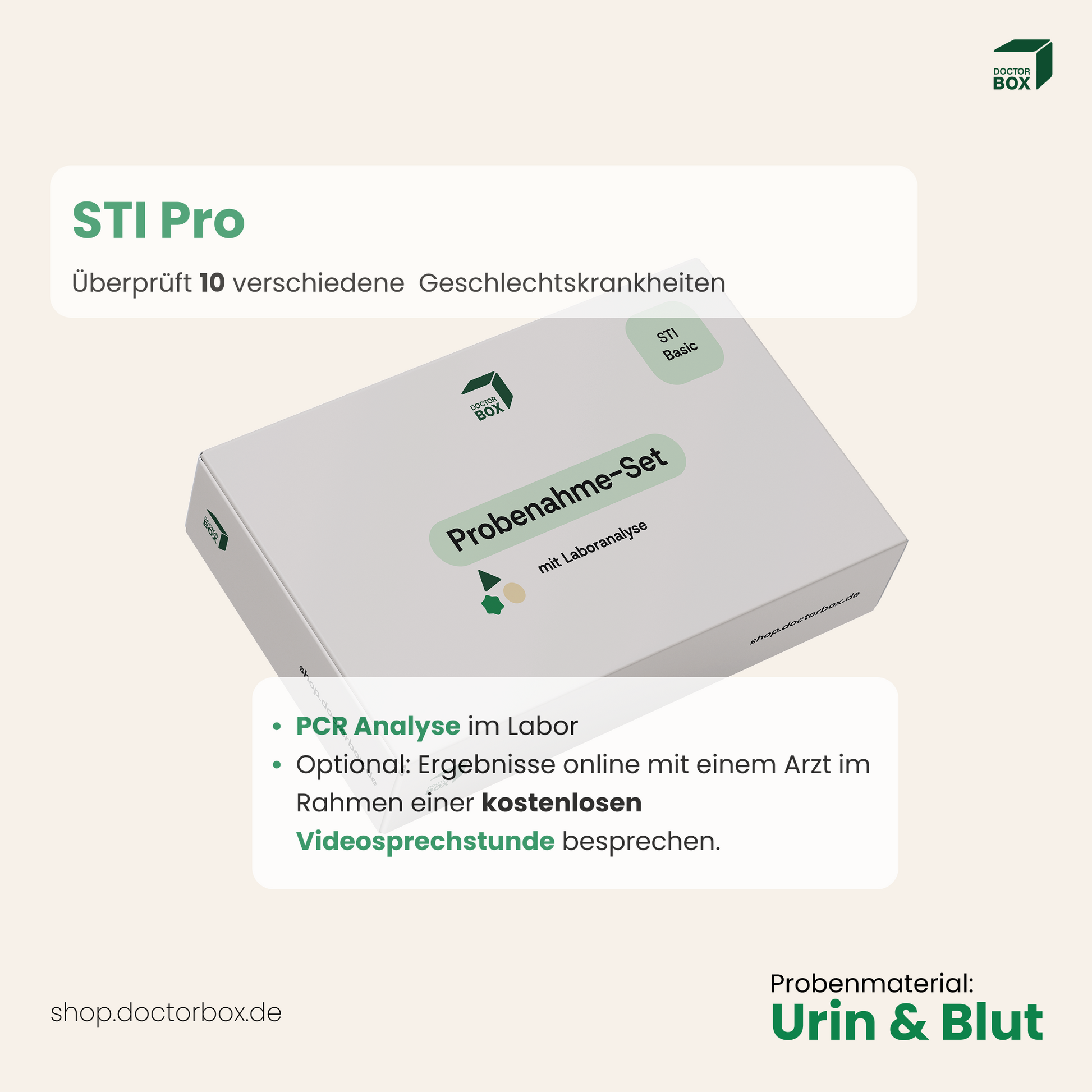 STIs sind häufig – und behandelbar. Prävention, regelmäßige Tests und frühe Behandlung sind die beste Strategie. Mit den DoctorBox-Probenahme-Sets wie STI Pro und STI Standard überprüfst du deine sexuelle Gesundheit einfach & diskret von zu Hause.