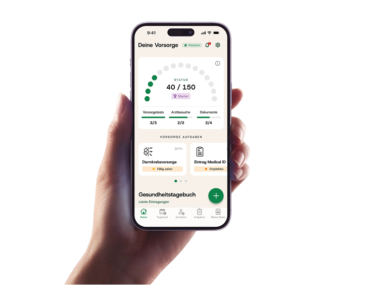 Wähle deinen jährlichen Heimtest (Darmkrebs oder Blutzucker), erhalte smarte Erinnerungen, KI-gestützte Empfehlungen, sichere Dokumentenverwaltung und deine persönliche Medical ID: