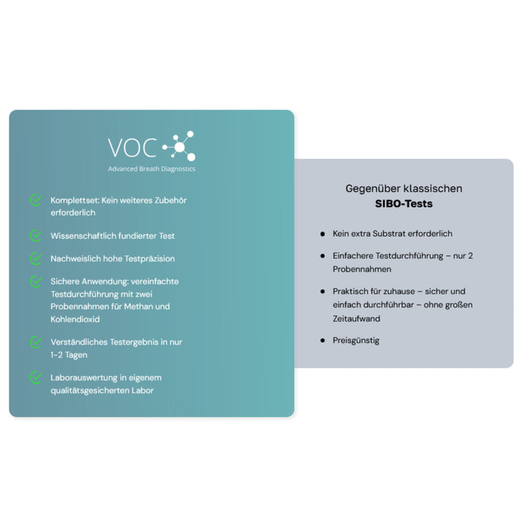 Mit dem VOC-IMO-Testkit erhalten Sie eine detaillierte Anleitung für die Vorbereitung auf den Test sowie die Testdurchführung. Die Testanleitung basiert auf den Empfehlungen europäischer und amerikanischer medizinsicher Leitlinien zur Testung auf SIBO. Bitte lesen Sie die Anleitung genau durch und befolgen Sie die Empfehlungen, da nur so ein verlässliches Testergebnis erzielt werden kann.