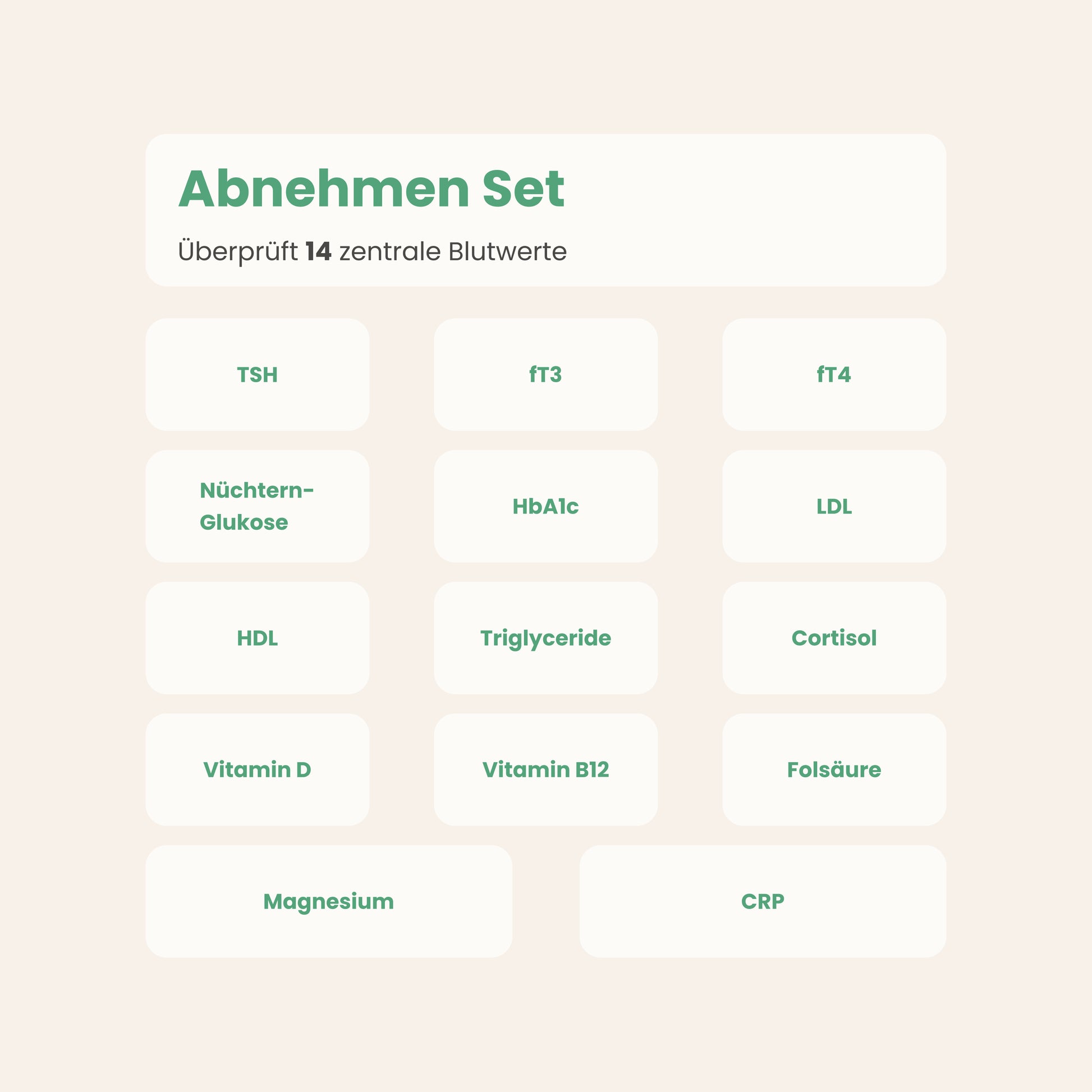 Unexplained weight gain or trouble losing weight can have many causes – from hormones and nutrient deficiencies to metabolic disorders. With the Weight Loss Set, you get a comprehensive overview of your thyroid, blood sugar, fat metabolism, stress hormones, nutrients, and inflammation markers – conveniently from home and professionally analyzed in the lab.