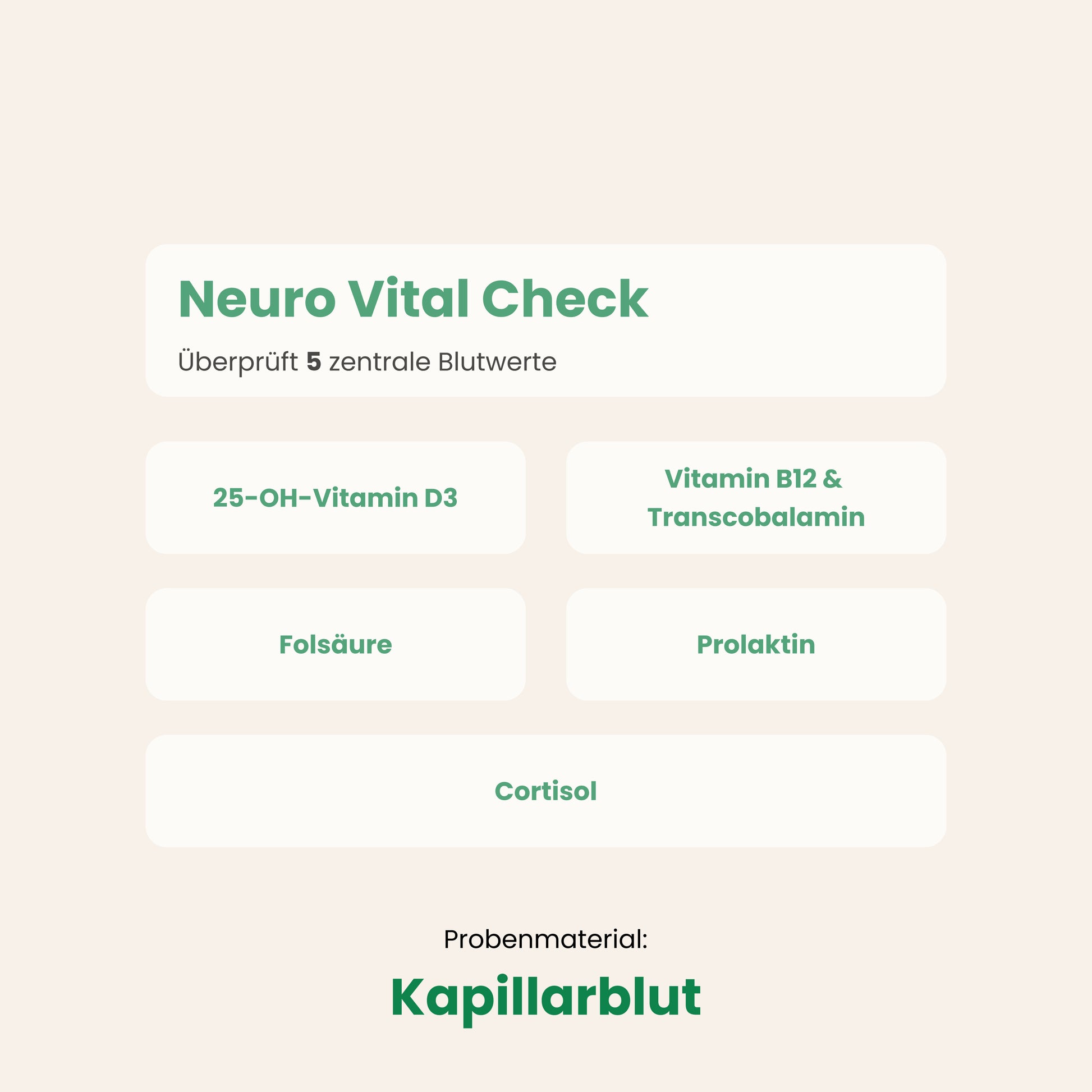 Vitamins and hormones play a key role in your nervous system, energy, and well-being. With the Neuro Vital Check, you get important insights into nutrient and hormone levels that are crucial for your brain, nerves, and stress regulation—all from the comfort of home and professionally analyzed in a lab.