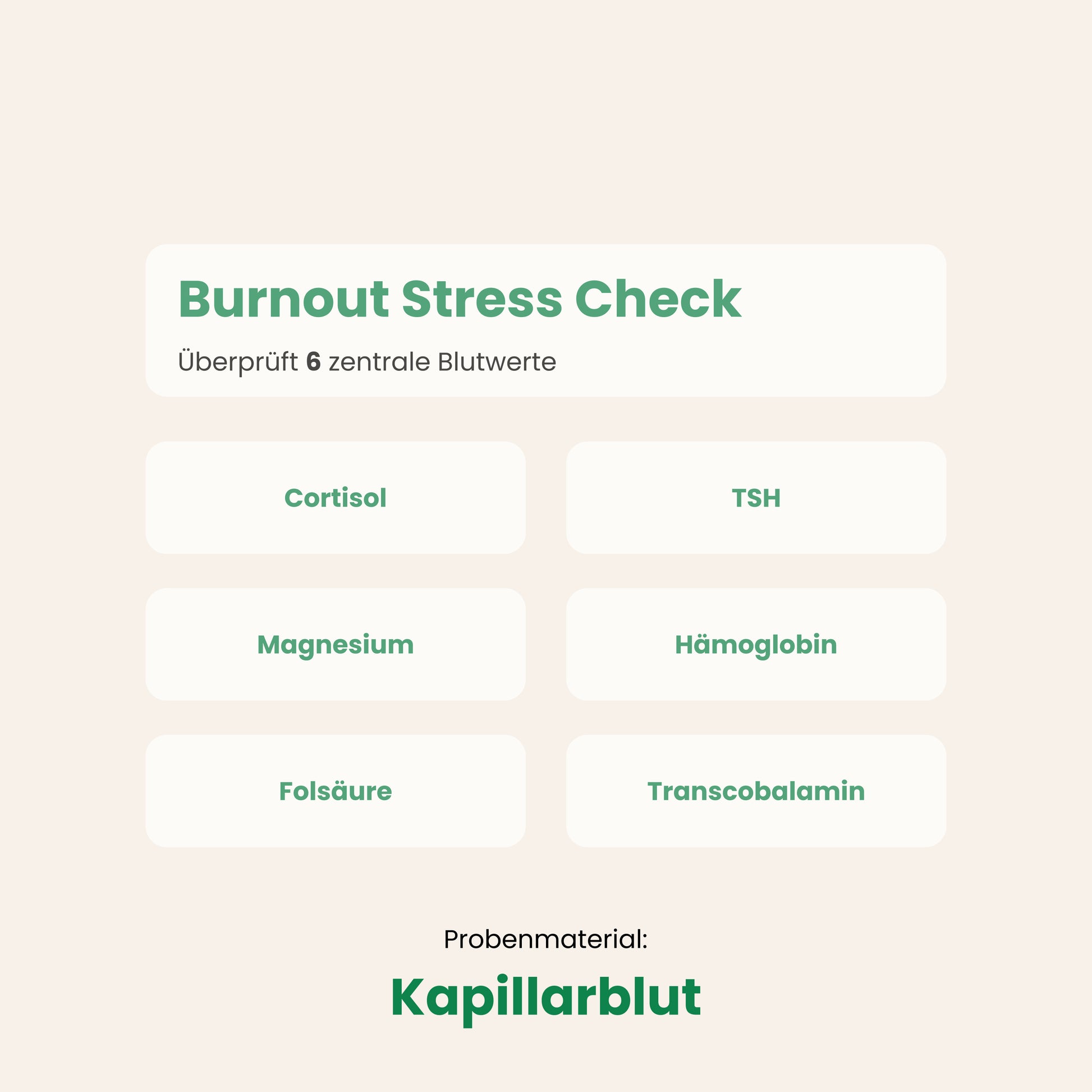 Dauerhafter Stress kann Körper und Geist stark belasten. Mit dem Burnout Stress Test erhältst du wertvolle Einblicke in Stresshormone, Schilddrüse und wichtige Nährstoffe, die dein Energielevel beeinflussen. Einfach von zu Hause – mit professioneller Laborauswertung und digitalem Ergebnis.