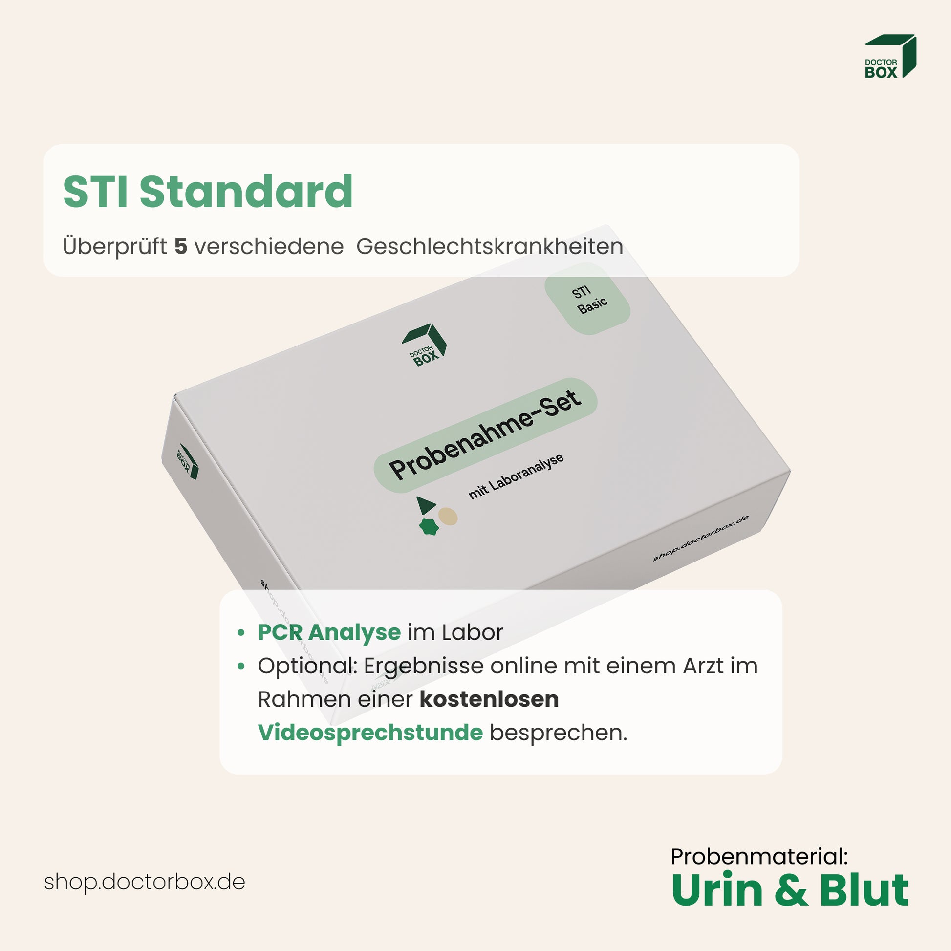 Mit dem STI Standard Heimtest testest du dich bequem von zu Hause aus auf fünf der häufigsten sexuell übertragbaren Infektionen (STIs). Du nimmst zwei Probenarten – Urin & Trockenblut oder Vaginalabstrich & Trockenblut – sendest sie kostenlos ins Labor und erhältst dein Ergebnis diskret und sicher über die DoctorBox App.